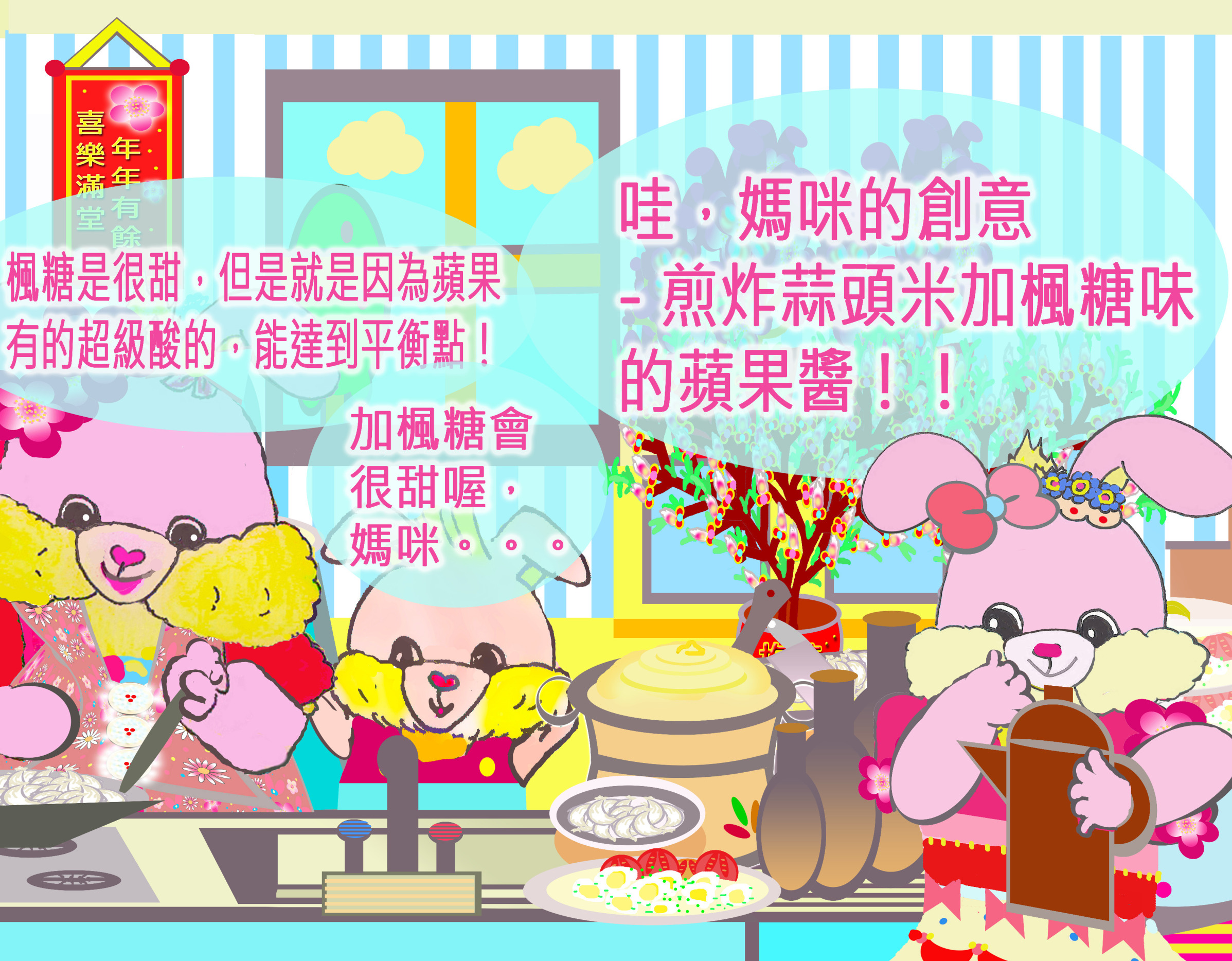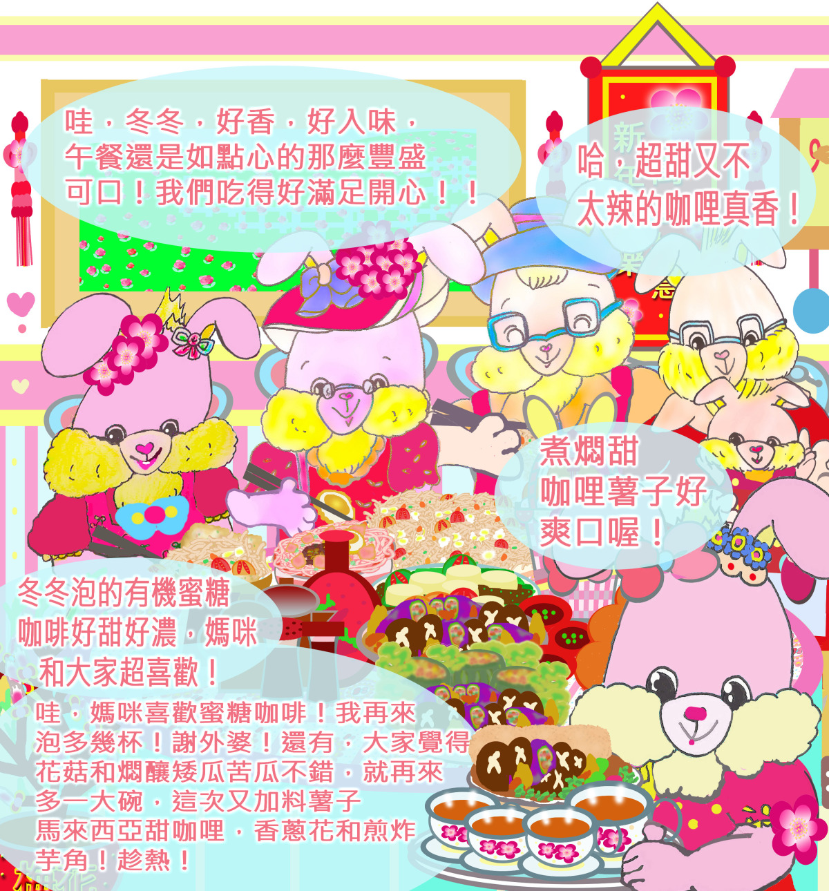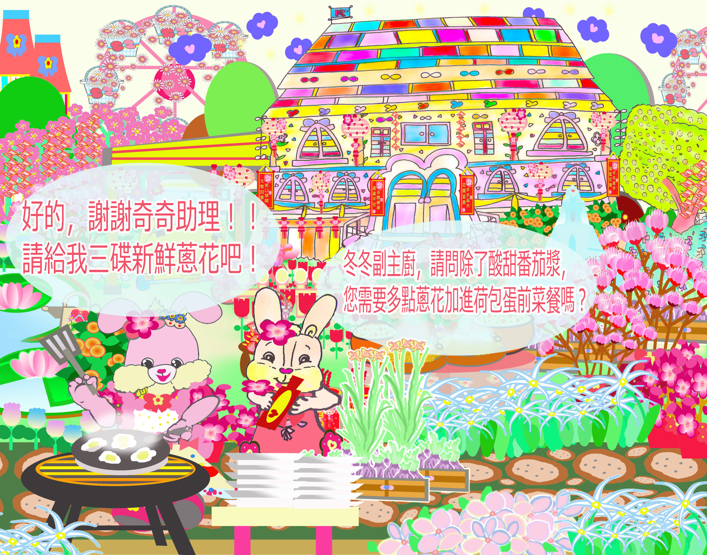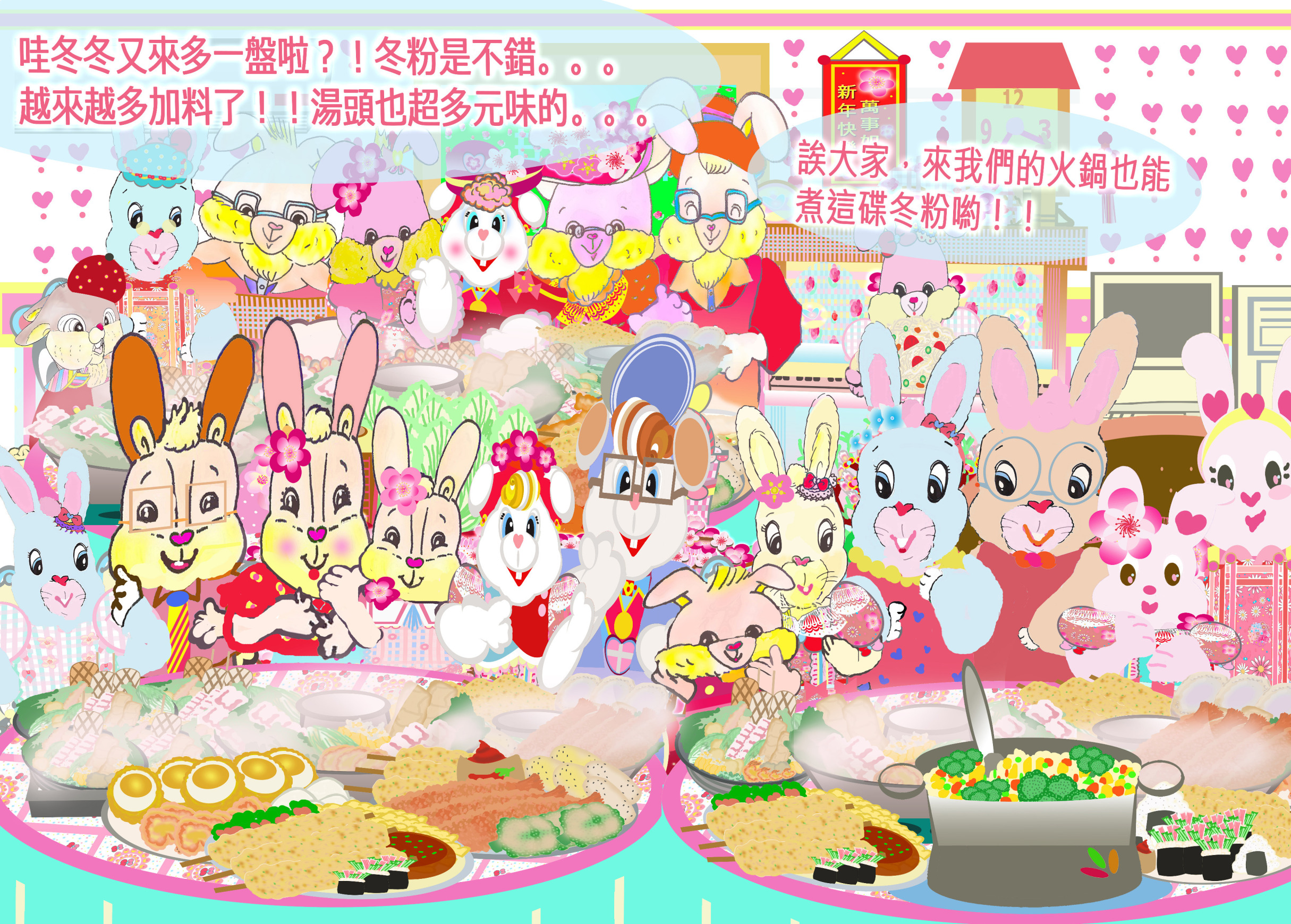 語恩:誒,媃媃,跟妳們講這“小冬冬”零食的故事喔。。。姐姐給我們知道的。。。“小冬冬”的卡通裡是在家的菜園種植七種顏色的蘿蔔,所以啊,陳阿姨和況阿姨設定零食有七種口味。。。彩虹的每一色調代表著不同的菜類,水果或食物的相關顏色的口味。。。橙色就是蘿蔔味啦!!還有,(看列表)黃色是檸檬蜜糖味。。。紅色是。。。番茄與甜椒味。。。紫色是番薯加矮瓜味!!那麼。。。藍色的。。。是藍莓和康科德葡萄口味。。。好甜的薯片啊!!之所以,主題曲是 “彩虹的菜園”!!