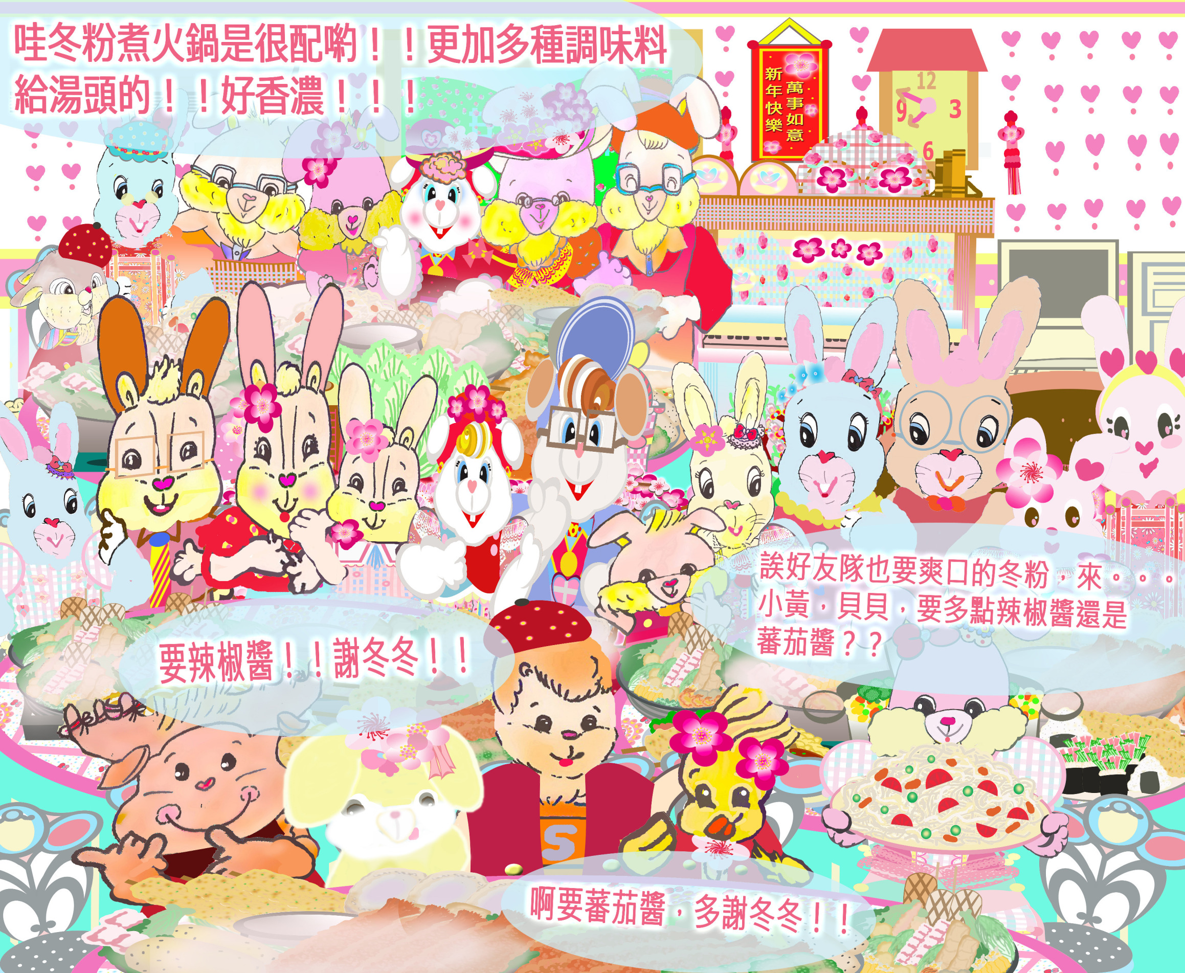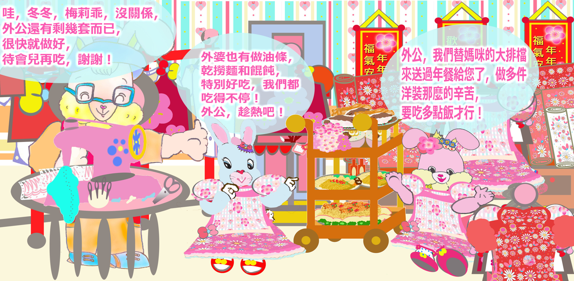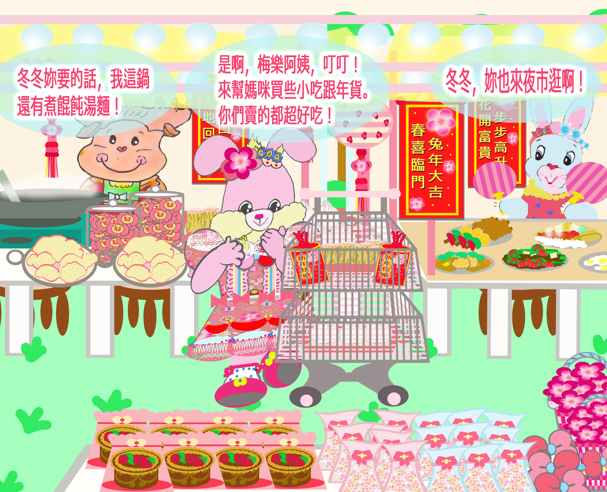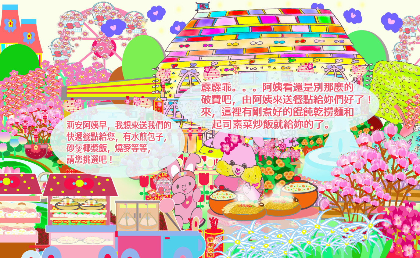 語恩:誒,媃媃,跟妳們講這“小冬冬”零食的故事喔。。。姐姐給我們知道的。。。“小冬冬”的卡通裡是在家的菜園種植七種顏色的蘿蔔,所以啊,陳阿姨和況阿姨設定零食有七種口味。。。彩虹的每一色調代表著不同的菜類,水果或食物的相關顏色的口味。。。橙色就是蘿蔔味啦!!還有,(看列表)黃色是檸檬蜜糖味。。。紅色是。。。番茄與甜椒味。。。紫色是番薯加矮瓜味!!那麼。。。藍色的。。。是藍莓和康科德葡萄口味。。。好甜的薯片啊!!之所以,主題曲是 “彩虹的菜園”!!