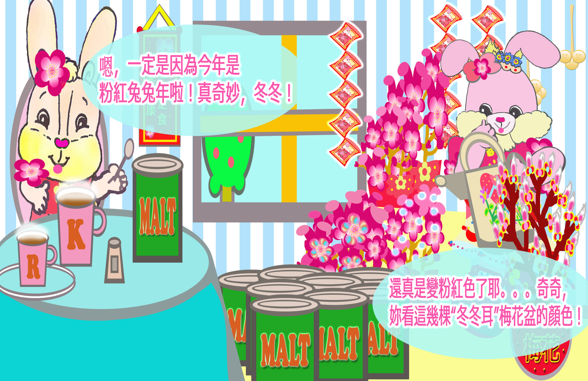 語恩:誒,媃媃,跟妳們講這“小冬冬”零食的故事喔。。。姐姐給我們知道的。。。“小冬冬”的卡通裡是在家的菜園種植七種顏色的蘿蔔,所以啊,陳阿姨和況阿姨設定零食有七種口味。。。彩虹的每一色調代表著不同的菜類,水果或食物的相關顏色的口味。。。橙色就是蘿蔔味啦!!還有,(看列表)黃色是檸檬蜜糖味。。。紅色是。。。番茄與甜椒味。。。紫色是番薯加矮瓜味!!那麼。。。藍色的。。。是藍莓和康科德葡萄口味。。。好甜的薯片啊!!之所以,主題曲是 “彩虹的菜園”!!